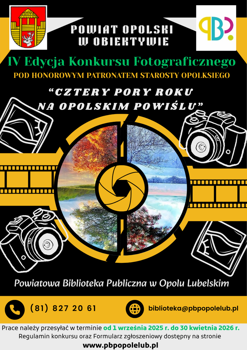 Starostwo Powiatowe w Opolu Lubelskim, Powiatowa Biblioteka Publiczna w Opolu Lubelskim oraz Muzeum Regionalne w Kluczkowicach serdecznie zapraszają do IV Edycji Konkursu Fotograficznego „POWIAT OPOLSKI W OBIEKTYWIE” , którego tegorocznym tematem przewodnim są „Cztery pory roku na Opolskim Powiślu”.